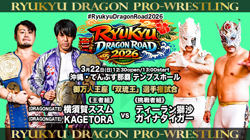 DRAGONGATEに流出からの逆輸入王者であるススム&KAGETORAが、沖縄の地で防衛戦。対するは2月23日の那覇大会で決まる挑戦者チームがどこになるかで試合の色が変わっていくでしょう。ご注目を!